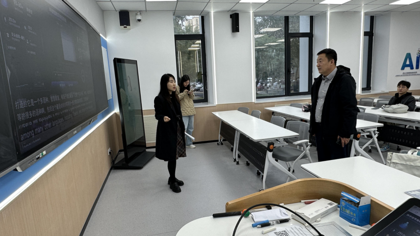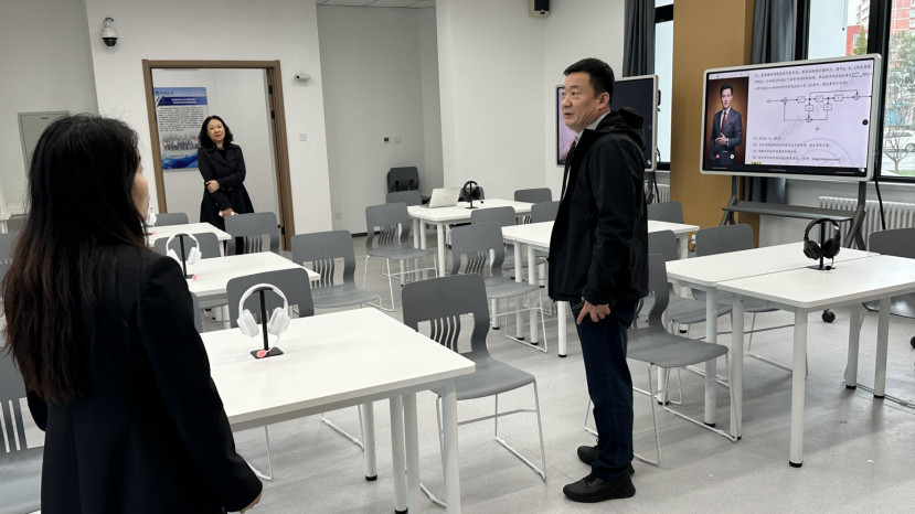 调研过程中,周永伟书记先后走进未来学习大楼智能研讨型教室、沉浸互动型教室、无感交互型教室、多语种智慧教室等多类型智慧教室参观调研。郜盼盼副处长详细介绍智能研讨型教室所构建的“师-生-机”三元协同教学模式,同步展示数字人助教与学生学伴的实时互动场景;随后讲解沉浸互动型教室对跨校区远程互动教学的支撑机制,深入阐释“无边界大学”的建设理念与实践路径;最后现场演示无感交互型教室的多模态感知功能,以及多语种智慧教室的多语言同声传译、课堂文字智能转写等功能,全方位呈现我校智慧教室的建设成果。