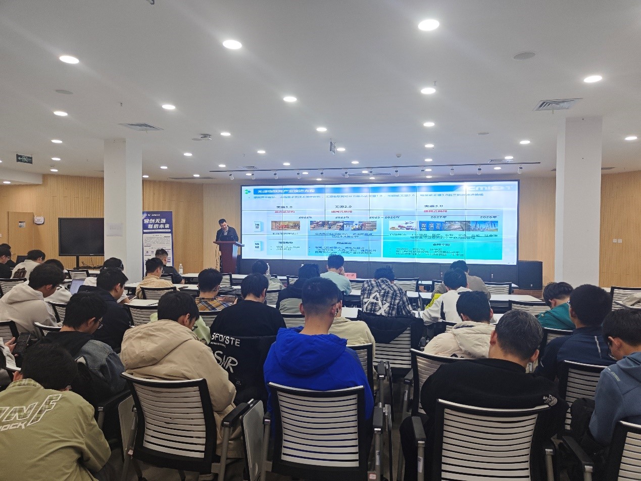 随后的赛事宣讲部分,马红平向现场学生详细介绍了本次大赛的赛制与核心亮点。赛事聚焦无源物联网、5G-A、人工智能、视联网等前沿技术领域,围绕技术创新、电子设计、产业赋能三大核心方向,采用“赛题驱动+技术攻关”的创新模式,加快前沿科技成果的转化与应用,推动智能物联网产业实现高质量发展。